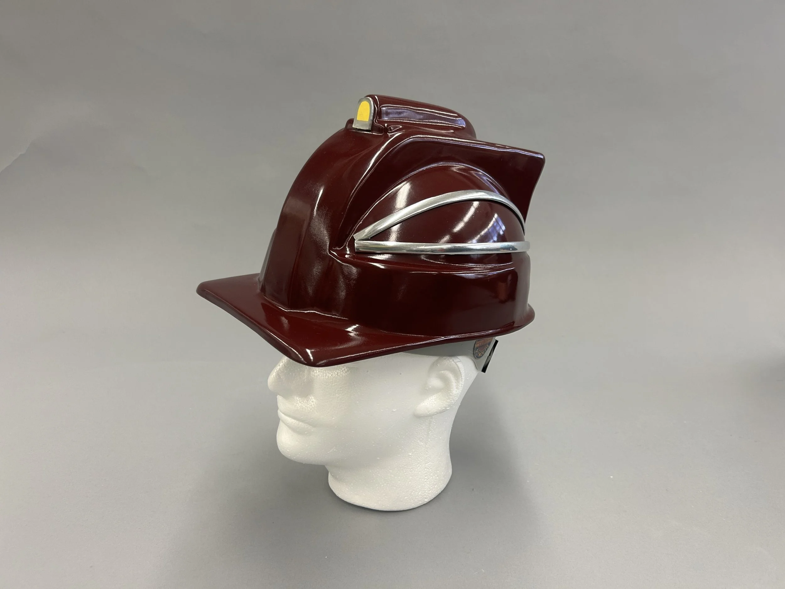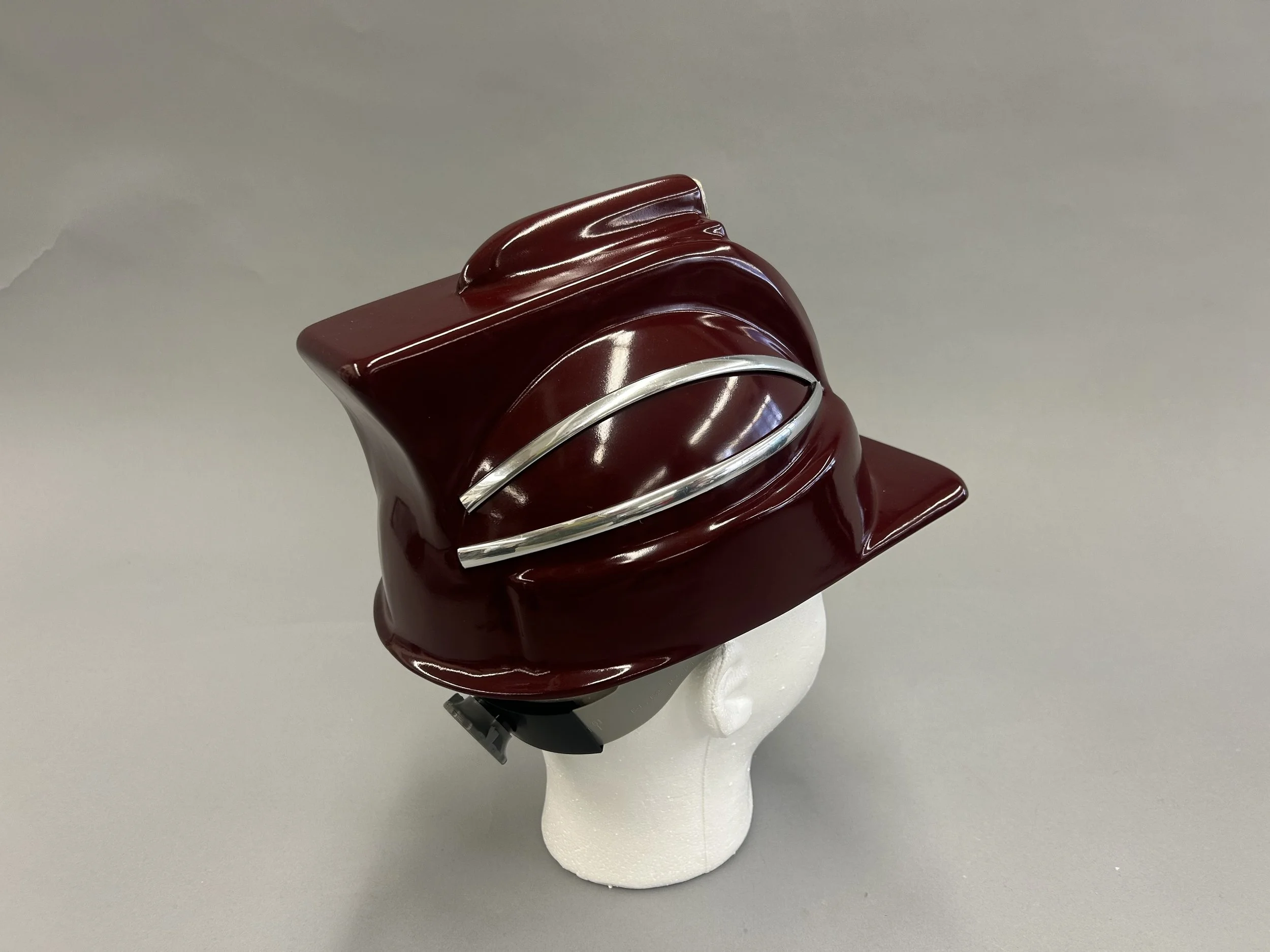 Using a standard hardhat as a base, I created foam core elements to mock-up my desired form, then vacuum-sealed over the elements and original hardhat. After lots of bondo, I used automotive paint for the finish.
